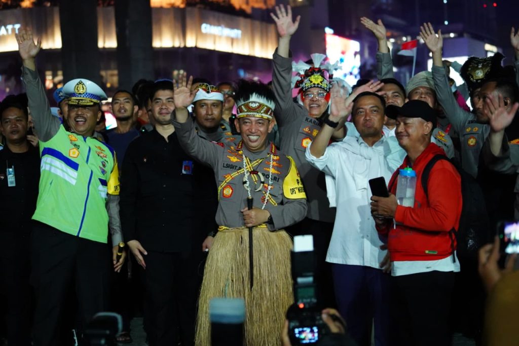Kapolri Jenderal Listyo Sigit Prabowo hadir langsung di lokasi untuk meninjau jalannya kegiatan dan memastikan seluruh rangkaian berlangsung aman dan tertib. Didampingi Menteri Sekretaris Negara Prasetyo Hadi, Kapolri berkeliling menyapa warga, berdialog dengan peserta karnaval, serta menyaksikan penampilan di panggung rakyat yang menjadi daya tarik utama malam itu.